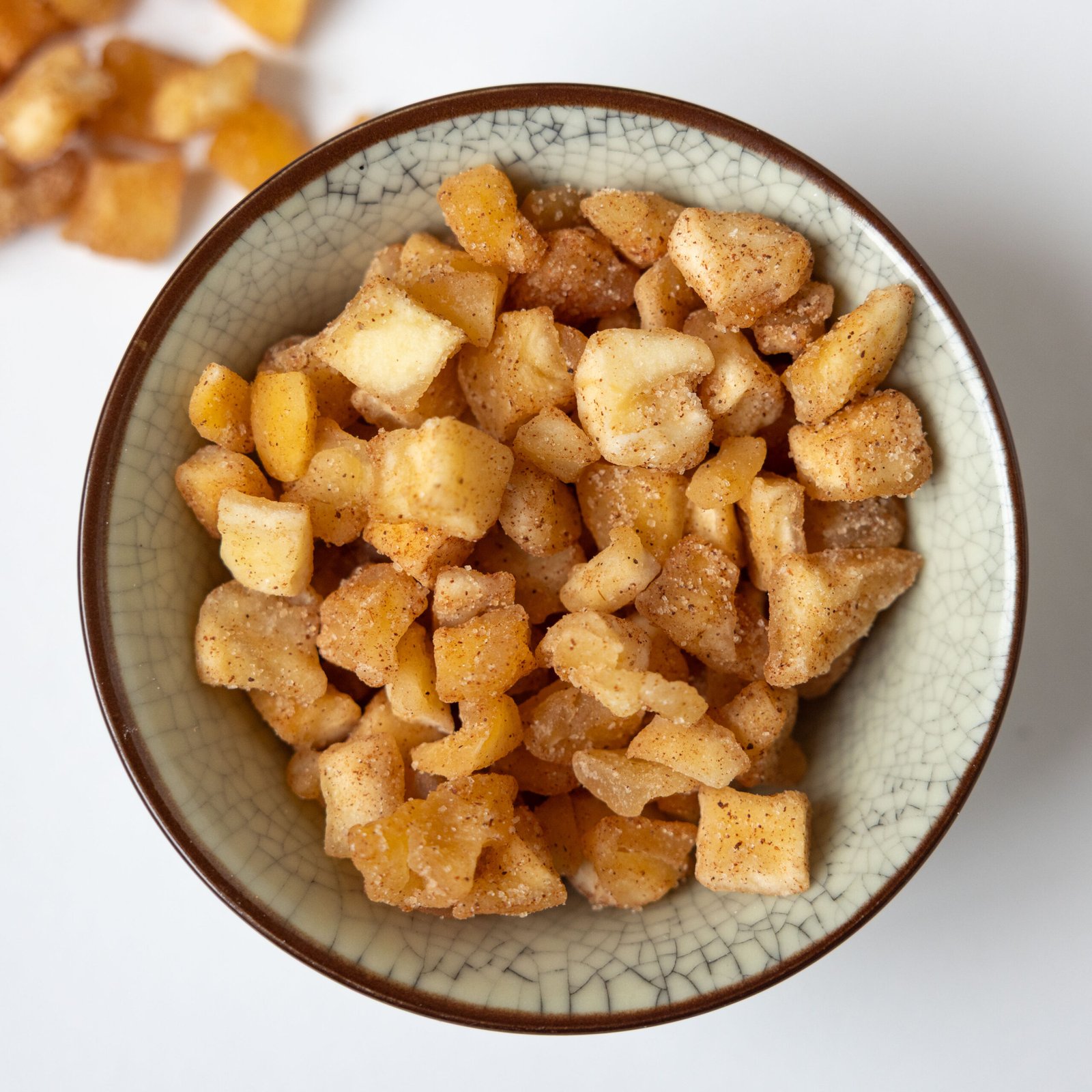 Gedroogde, gezoete appelstukjes met kaneel. Een heerlijk zoete snack!